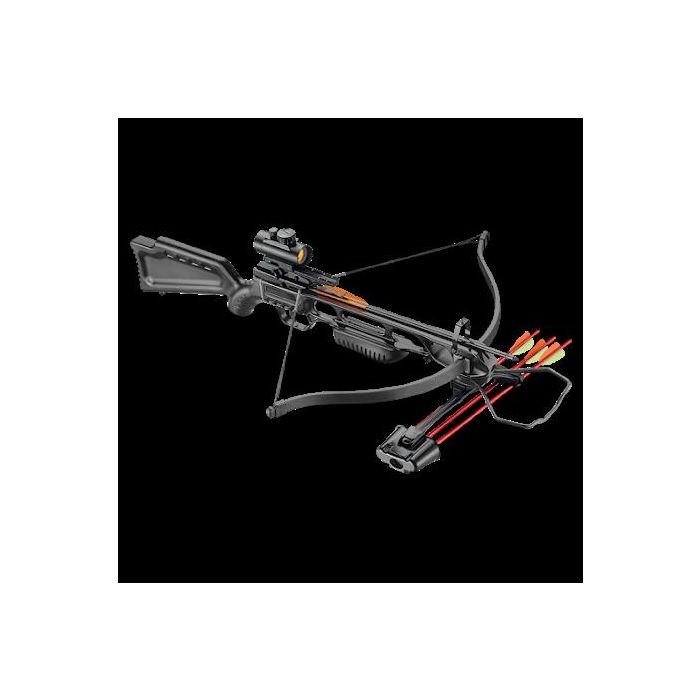 This model of Crossbow is the Deluxe version of the EK Archery Jaguar crossbow and features increased power and speed, along with a red dot sight, sling, and a 3 bolt quiver for added versatility.