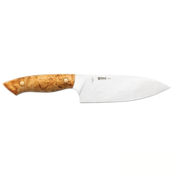The Helle Dele Outdoor Chef Knife is a premium culinary tool crafted for both kitchen and outdoor use. Developed with professional chefs who embrace cooking in nature, it blends refined design with rugged functionality. The 12C27 stainless steel blade is highly polished for razor-sharp performance, featuring a full flat grind and a versatile shape that combines the control of a Santoku with the balance of a classic European chef knife.