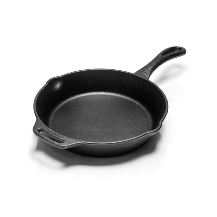 The high-quality cast iron with its outstanding heat distribution can be used immediately and is easy to clean thanks to the pre-seasoned surface. The durable and sturdy skillet has a natural anti-adhesive effect that you will improve at each use, for a protective layer forms. Moreover, cast iron stores heat well, which is why you can serve your meals directly in the skillet.