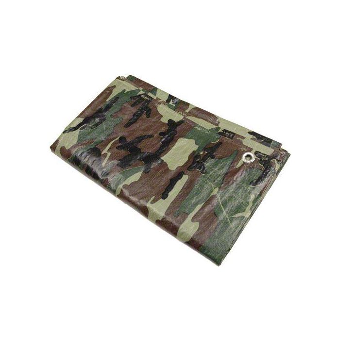 Camo & Olive Green Reverisble tarp, Ideal for shelter building, covering, hide making etc. All tarps are 80gsm army camo tarpaulins are an economy grade lightweight tarp that comes with 12mm aluminium eyelets at 1 metre intervals in reinforced hems, and remain flexible even in sub-zero temperatures. Our camo tarps are not only waterproof but also UV protected, rotproof and shrinkproof.